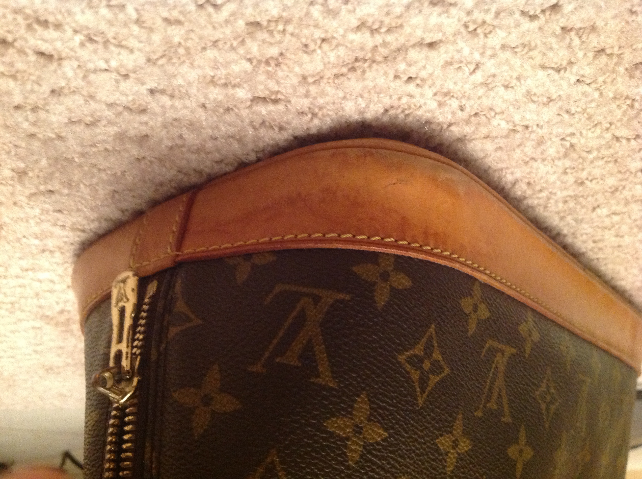 Beautiful bag, zipper works but color is a bit off, handles darkened by use, please see pictures. Interior is wonderful!
